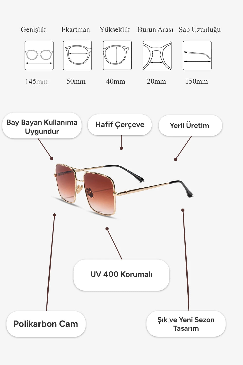 ✅ Tam Koruma: UV400 koruması sayesinde gözlerinizi zararlı UVA ve UVB ışınlarından maksimum seviyede korur. Güneşin zararlı etkilerini engelleyerek net ve konforlu bir görüş sunar.
