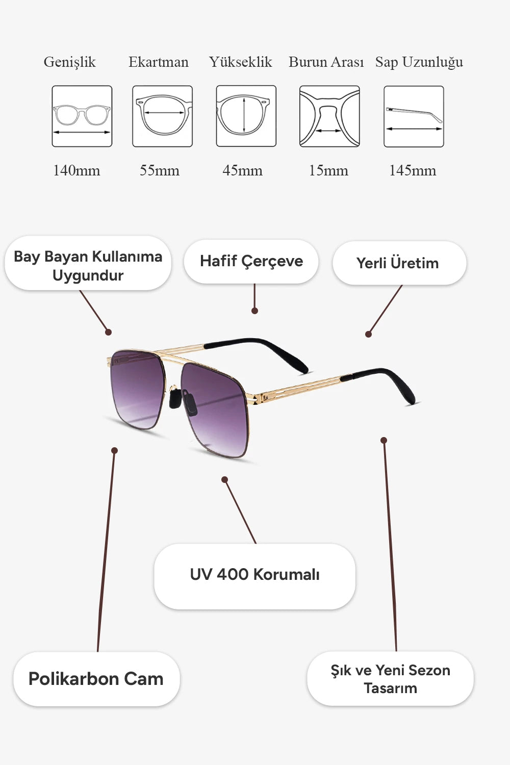 ✅ Tam Koruma: UV400 koruması sayesinde gözlerinizi zararlı UVA ve UVB ışınlarından maksimum seviyede korur. Güneşin zararlı etkilerini engelleyerek net ve konforlu bir görüş sunar.