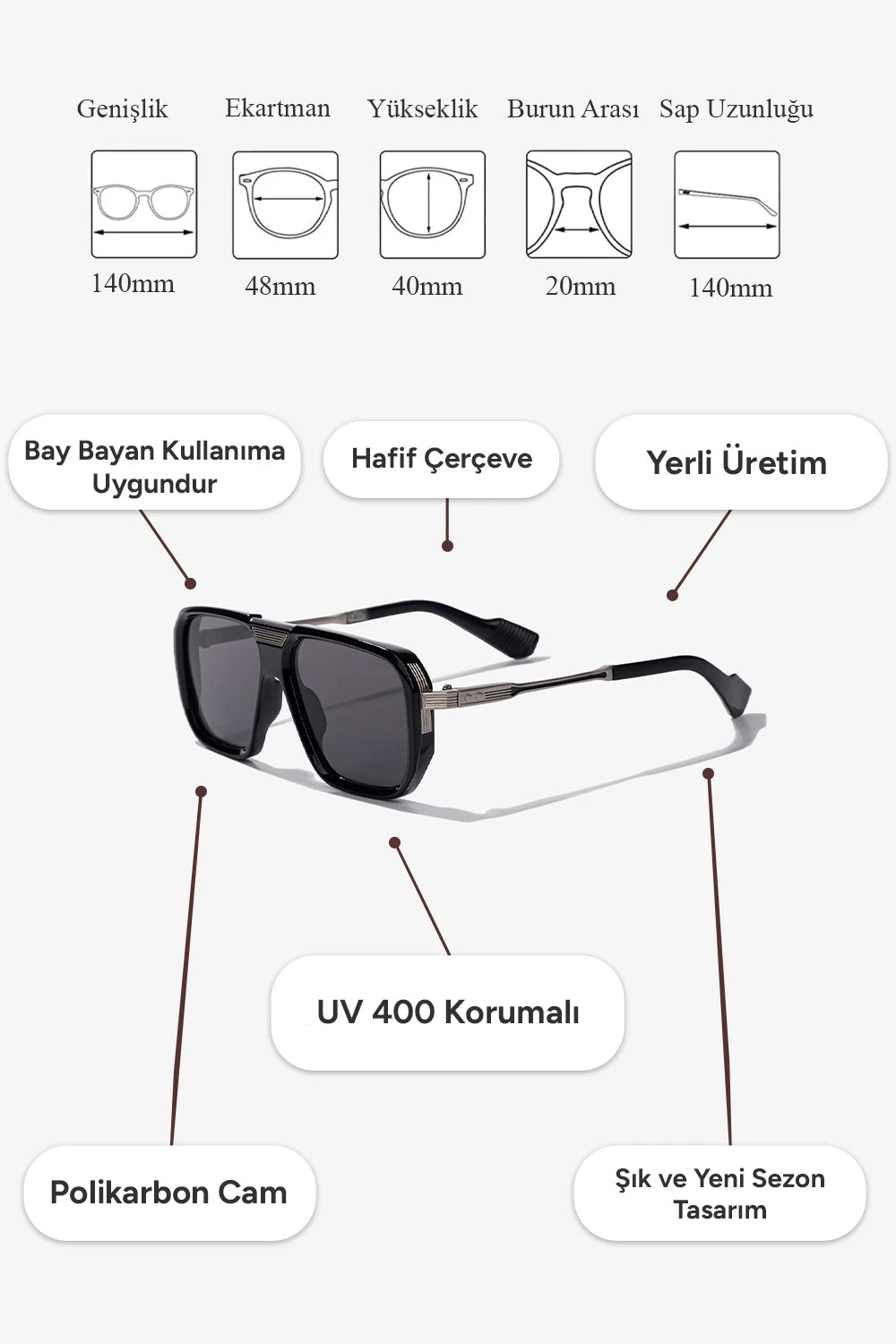 ✅ Tam Koruma: UV400 koruması sayesinde gözlerinizi zararlı UVA ve UVB ışınlarından maksimum seviyede korur. Güneşin zararlı etkilerini engelleyerek net ve konforlu bir görüş sunar.