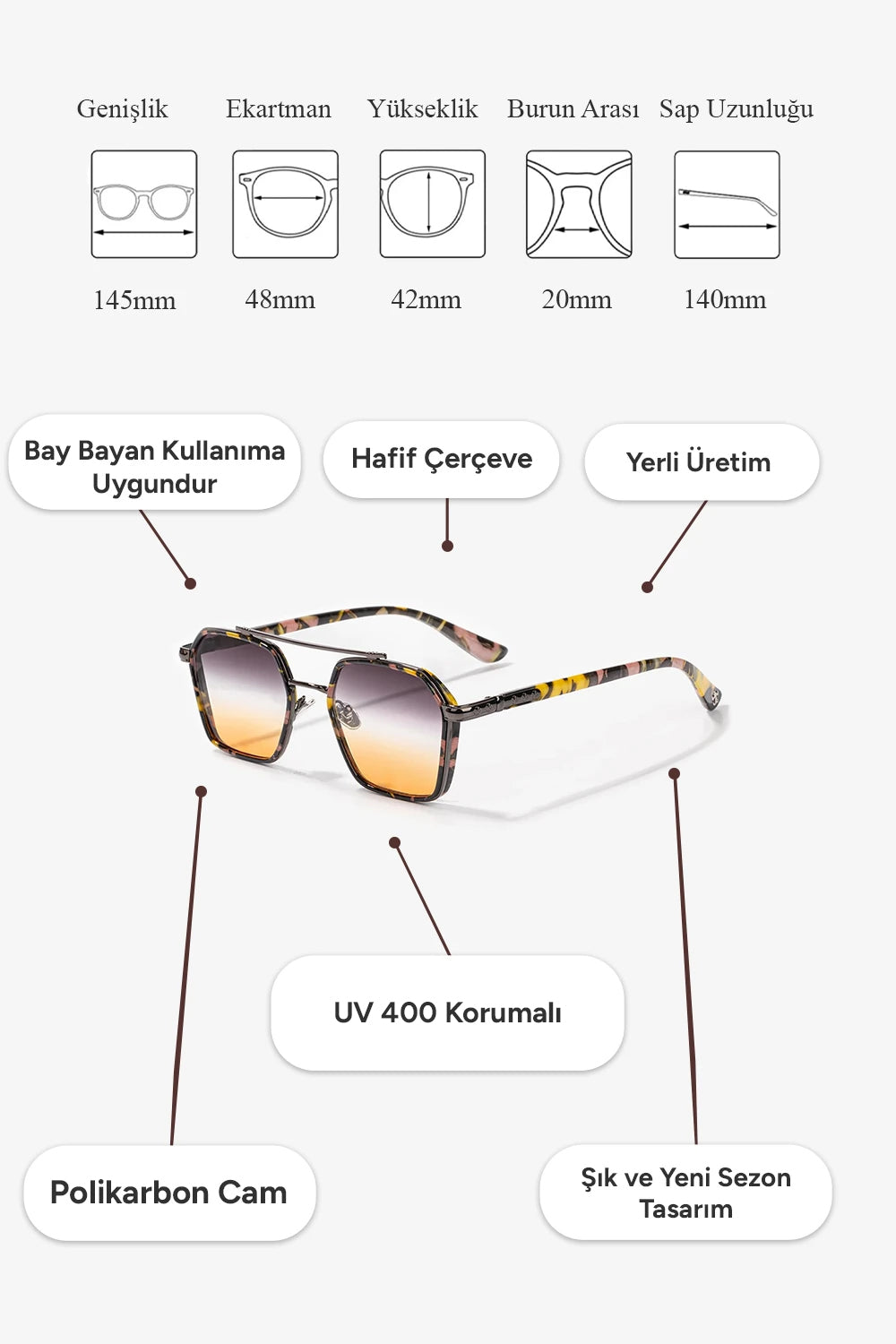 ✅ Tam Koruma: UV400 koruması sayesinde gözlerinizi zararlı UVA ve UVB ışınlarından maksimum seviyede korur. Güneşin zararlı etkilerini engelleyerek net ve konforlu bir görüş sunar.