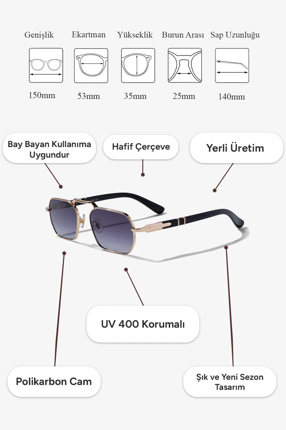 ✅ Tam Koruma: UV400 koruması sayesinde gözlerinizi zararlı UVA ve UVB ışınlarından maksimum seviyede korur. Güneşin zararlı etkilerini engelleyerek net ve konforlu bir görüş sunar.