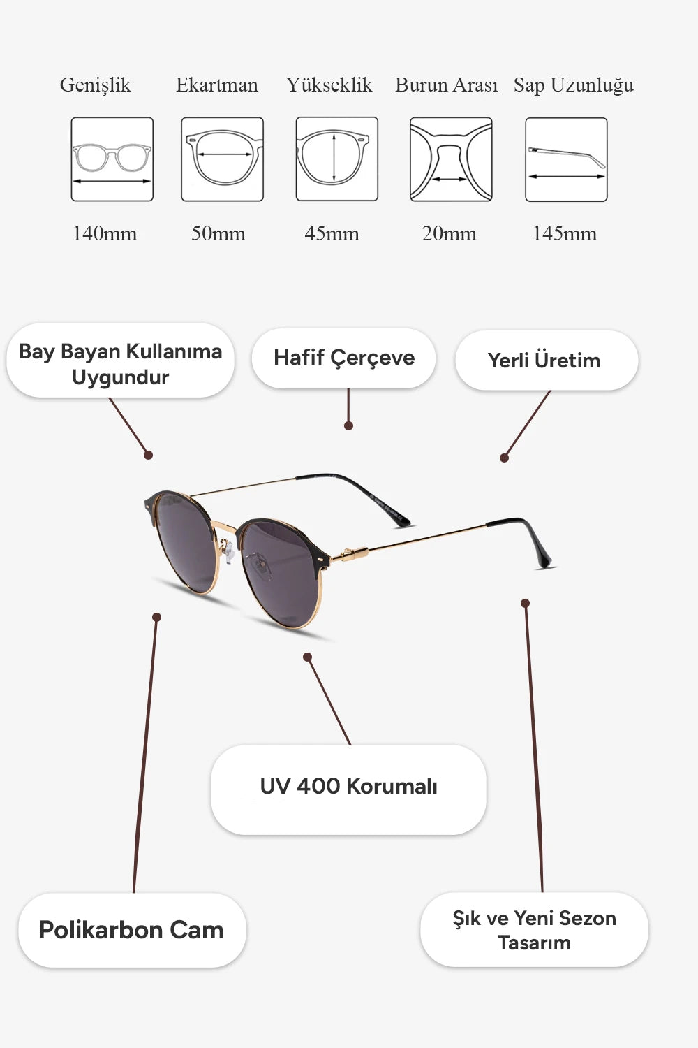 UV400 koruması sayesinde UVA ve UVB ışınlarını engeller, göz sağlığınızı korur. Özellikle güneşli havalarda göz yorgunluğunu azaltır.